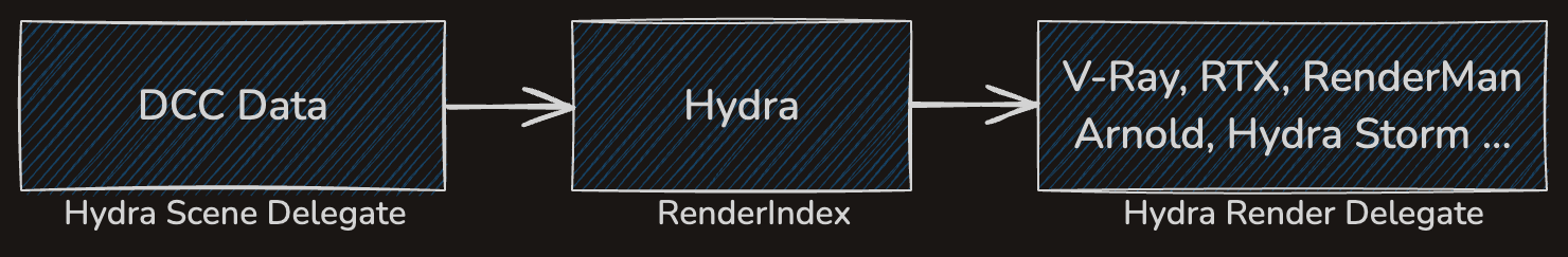 Scene Delegate: Provides the scene information.Render Index: Keeps track of changes and manages the scene.Render Delegate: Uses the render index and scene delegate to visualize scene information and create the final image.